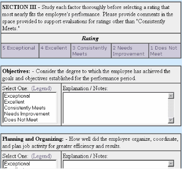 The next section deals with Rating the Employee. Click on the Rating that best describes the Employee's